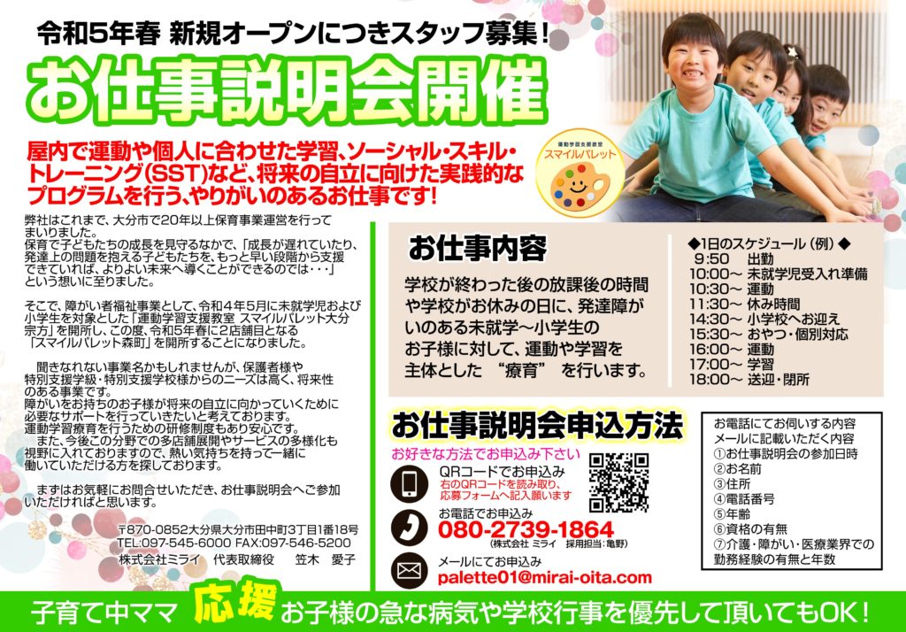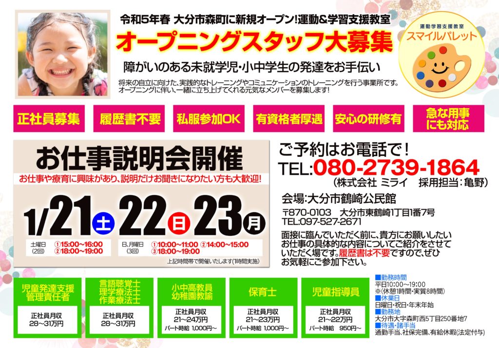 今年春 大分市森町にスマイルパレットが新規オープンいたします。オープニングスタッフを大募集!オープンに先駆けて、お仕事説明会を下記の通りに開催いたします。